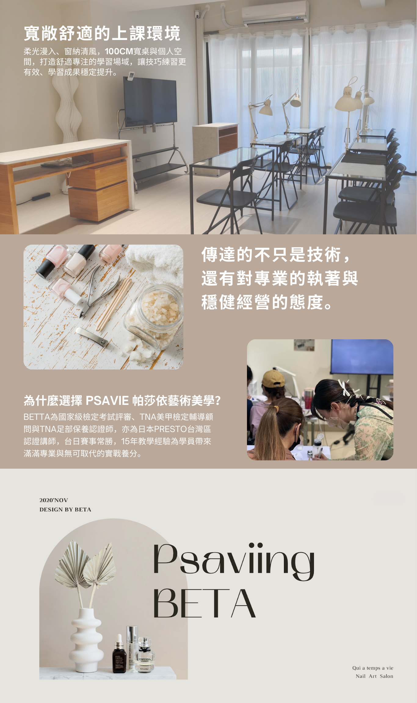 帕莎依藝術美學從全科到單項技術、從國考檢定到國內外賽事、從手足概論到深層保養,提供多樣化標準與客製課程,陪妳扎根專業 今年快要過了,不知道大家的目標實踐了嗎?讓自己持續前進閃閃發光吧ᕦ(ò_óˇ)ᕤ 課程月報╰(*´︶`*)╯♡11/20:國家丙級指甲彩繪檢定四日課程 (圓滿結束)11/24:Sparitual品牌手部深層保養師初階三日課程 (圓滿結束)12/10:足部病變甲認知概論分析線上課程 (圓滿結束)教你一次學會判別各種足部沙龍會出現的病變甲問題基礎全科班課程資訊╰(*´︶`*)╯♡12/2:日式凝膠基礎班六日 24小時穩紮穩打 (課程展開!)12/15:日式凝膠全科班15日 60小時美甲師養成之路 (即將開課!) 手足保養 課程介紹 凝膠基礎/全科班 課程介紹 彩繪造型 課程諮詢 沙龍延長 課程諮詢 檢定、競賽 課程介紹