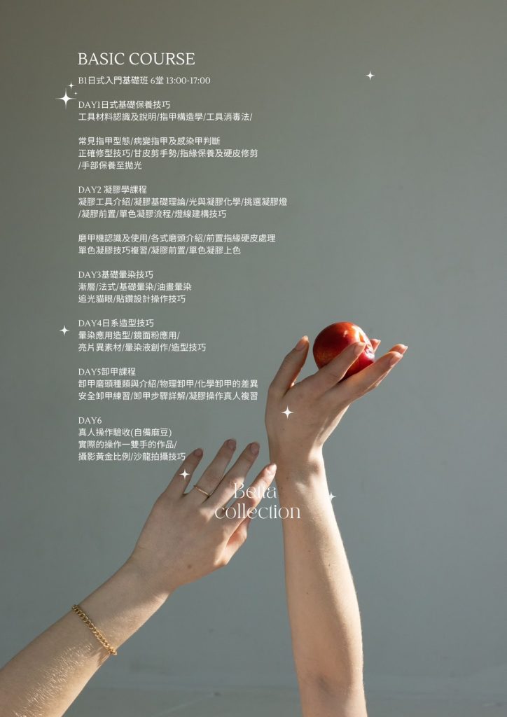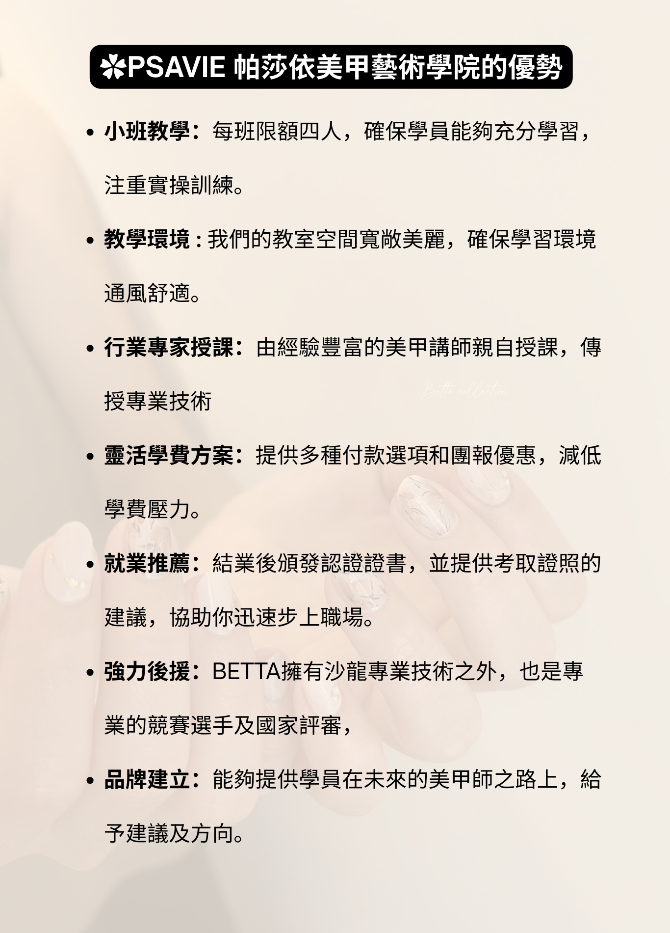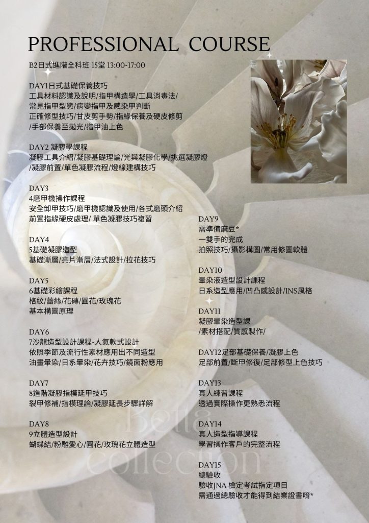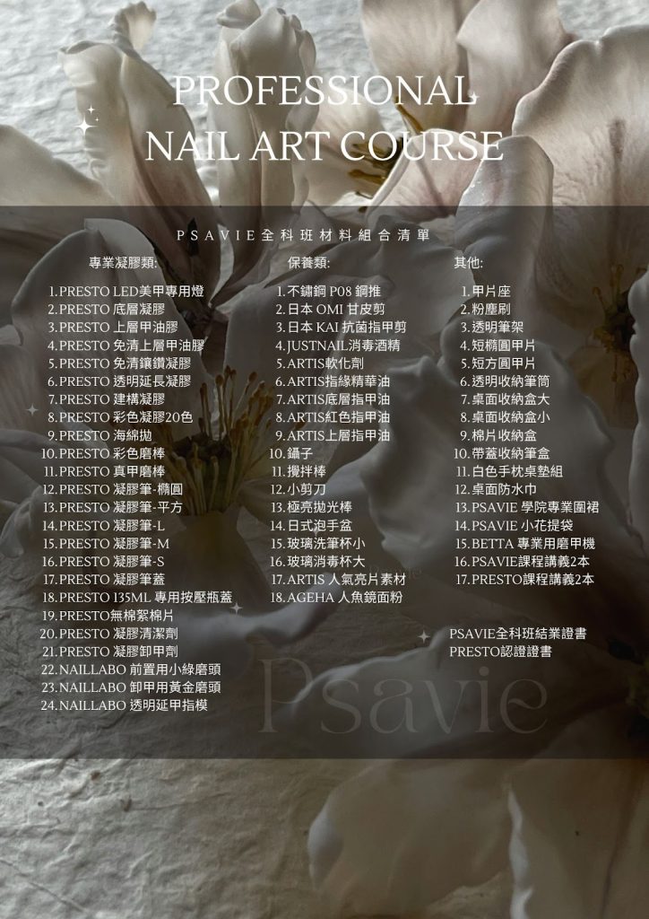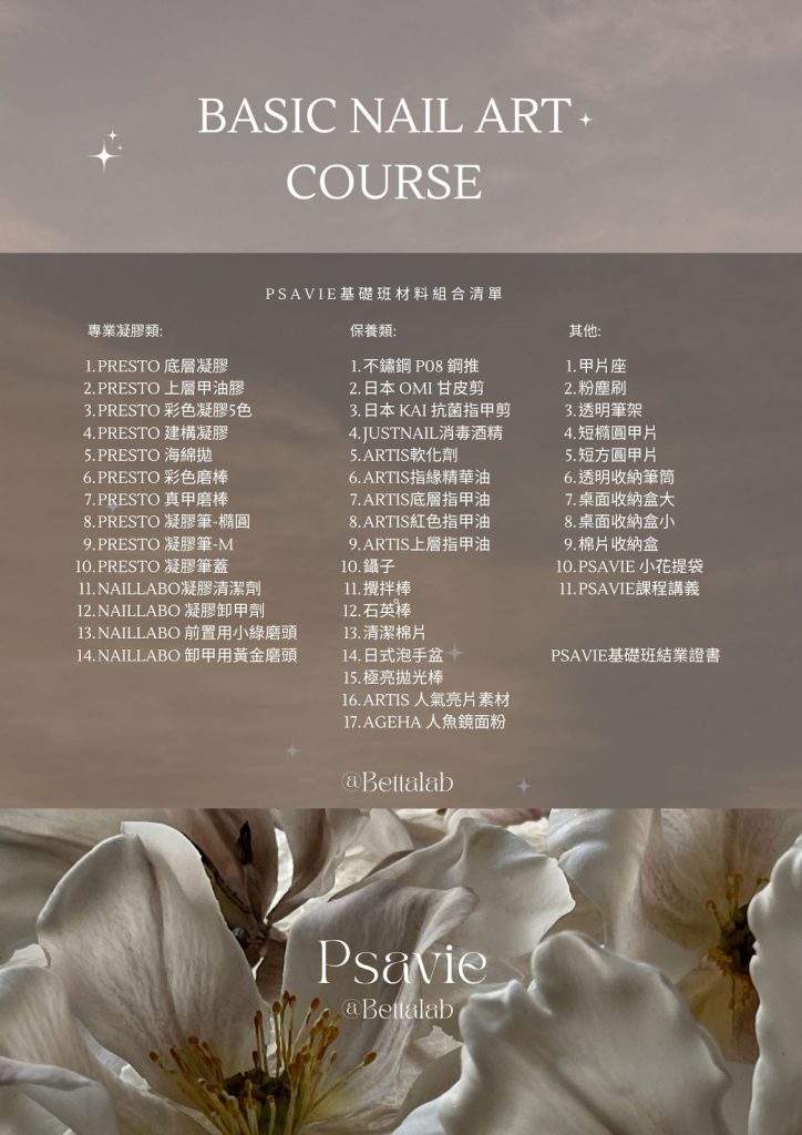 日式美甲✿入門基礎班 𓆸 ~ 成為一枚小種子 適合對象:對美甲有興趣的妳、入門最佳選擇 課程內含PRESTO系統基礎材料, 回家也能自主練習,讓熱愛在日常裡發芽。 從零起步,穩穩打底, 小班實作,重點拆解, 修型、前置、單色,一次學會。 日式美甲✿進階全科班 𓆸 ~ 會越來越茁壯 適合對象:穩扎穩打,半年後想成為美甲師的妳 課程內含Presto系統全套材料 + PRESTO凝膠燈 + AD商業用磨甲機 為專業美甲師操作客戶所使用的完整套組, 工欲善其事、必先利其器, 不花冤枉錢、不走歪歪路, 直接提供您最高規格的教學與設備。 ✿全科班含21小時PRESTO系統課程內容,課程結業考核通過可申請PRESTO認證證書,為將來想成為品牌講師打好根基。 我是Betta ฅ •ﻌ•♡ 身為台灣國家檢定評審、日本PRESTO品牌講師,以及日本JNA國際美甲師試驗官等多重身分, 我的教學方針及指導目的在於,訓練及挖掘出優秀的美甲師人才,成為台灣的美甲市場增添新的生力軍! 無論基礎班或全科班,都是精緻小班制上課。 最多只會有四位同學一起上課,最少兩位即可開班唷~另外也有一對一特別專班,上課節奏快、費用也比較高適合短時間目標明確者 ✧⁺⸜(˙▾˙)⸝⁺✧ 在我們家的系統教學之下,全新手可以安心上課。我們課程注重理論根基,打好基礎才能持續向上發展。 上課方式為每週固定上課一日,確保大家能夠有足夠時間複習課程所學。 Betta重視理論教學及實際操作,確保每位學員能夠真正上手學習美甲帶來的美好。一起加入我們,成為專業的美甲師吧˗ˋˏ ♡ ˎˊ˗ 努力的這條路上有我帶領 ~ 基礎班課程材料 全科班課程材料PRESTO凝膠燈、專業用磨甲機、黃金卸甲磨頭等等,各種小東西都幫妳準備好了💫 所有課程材料皆從日本 Nail Labo 在台分公司進貨,含完整中文標籤,可直接銜接創業或考試用都沒問題,請安心使用 我們的課程核心 15堂課程,為期三個月半至四個月的學習, 除了理論與技術課程之外, 最精彩的莫過於沙龍現場實習課程! 學員在課程學習過程中, 由老師示範如何操作, 可以近距離觀摩老師服務客戶的流程, 是非常珍貴的機會。 這也是BETTA教學的主要核心, 我們一向推崇的是學習的機會, 從不藏私! 反而希望大家多觀摩學習,為自己帶來成長。 希望大家能正確地走上美甲道路, 踏實踩穩每一步。 報名全科班課程,如果也想參加美甲檢定考試, 本學院提供美甲檢定考試競賽訓練模擬考一堂, 成為你的最強後盾👏👏 我們的教學優勢 我們的教學空間,明亮寬敞、舒適良好。 兩人小班好友同行 多人團班教學相長 學員作品 全科班內容進階課程‘穿戴甲設計’學完直接創業開賣場都可以 準備成為專業美甲師了嗎? 透過LINE聯絡我們!